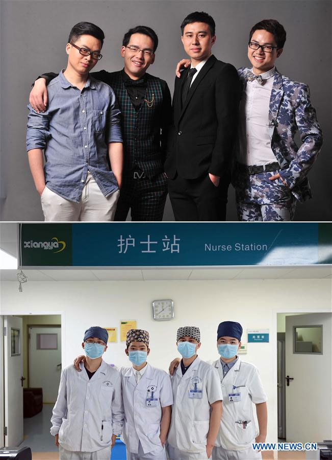 El enfermero Yang Rui (segundo derecha) posa para un retrato con sus colegas. (Foto de arriba) El enfermero Yang Rui (segundo derecha) posa con sus colegas en la estación de enfermería del Tercer Hospital de Xiangya de la Universidad Central South de Changsha, capital de la provincia de Hunan, el 10 de mayo de 2016. (Foto izquierda) El enfermero Yang Rui (C) posa para un retrato con sus colegas. En la actualidad el hospital cuenta con más de 30 enfermeros hombres de un total de 1.000 trabajadores. El 12 de este mes se celebra el Día Internacional de los Enfermeros. [Foto: Xinhua]