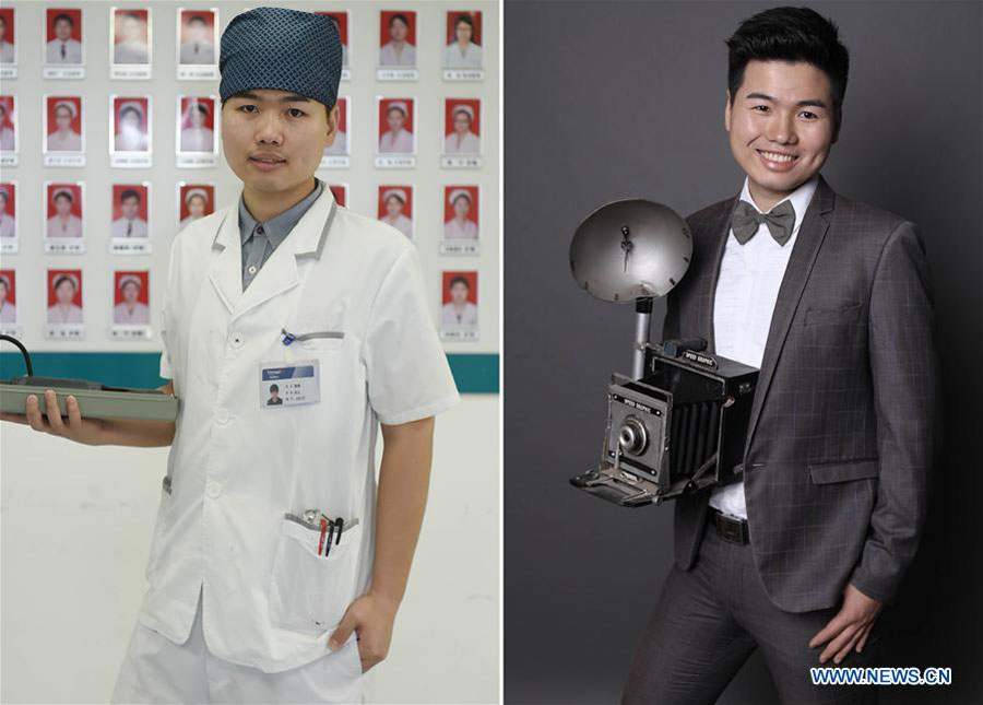 El enfermero Yang Rui posa en la estación de enfermería del Tercer Hospital de Xiangya de la Universidad Central South de Changsha, capital de la provincia de Hunan, el 10 de mayo de 2016. (Foto izquierda) El enfermero Yang Rui posa para un retrato. En la actualidad el hospital cuenta con más de 30 enfermeros hombres de un total de 1.000 trabajadores. El 12 de este mes se celebra el Día Internacional de los Enfermeros. [Foto: Xinhua]