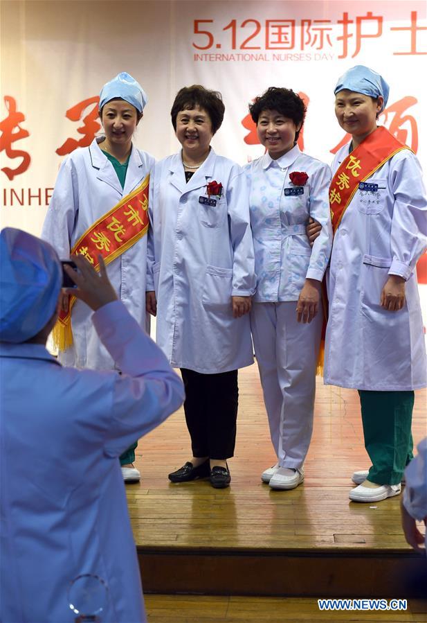 Beijing, 12 de mayo de 2016 (Xinhua)--Enfermeras se hacen una foto en la ceremonia de entrega de premios el Día Internacional de los Enfermeros en el Hospital Xuanwu de Beijing, el 12 de mayo de 2016. (Xinhua/Zhang Yuwei)