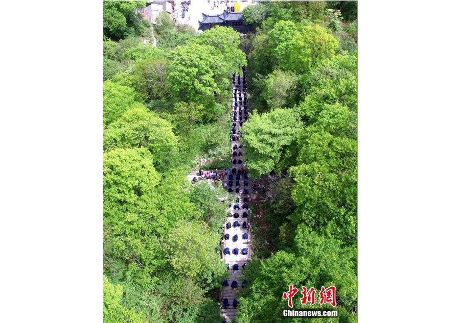 Cientos de sacerdotes taoístas se arrodillan en los escalones de piedra para presentar sus respetos a Li Er, fundador del taoísmo, durante la masiva ascensión al Templo de la Cúpula Dorada ubicado en la monta?a Laojun, ciudad de Luoyang, provincia de Henan, el 15 de mayo del 2016. [Foto: Chinanews .com]