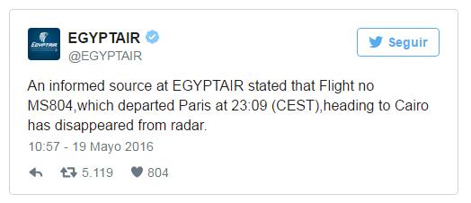El Cairo,19/05/2016(El Pueblo en Línea)-El vuelo MS804 de la compa?ía EgyptAir, que cubría el trayecto entre París y El Cairo ha desaparecido del radar, según ha confirmado la propia compa?ía aérea.