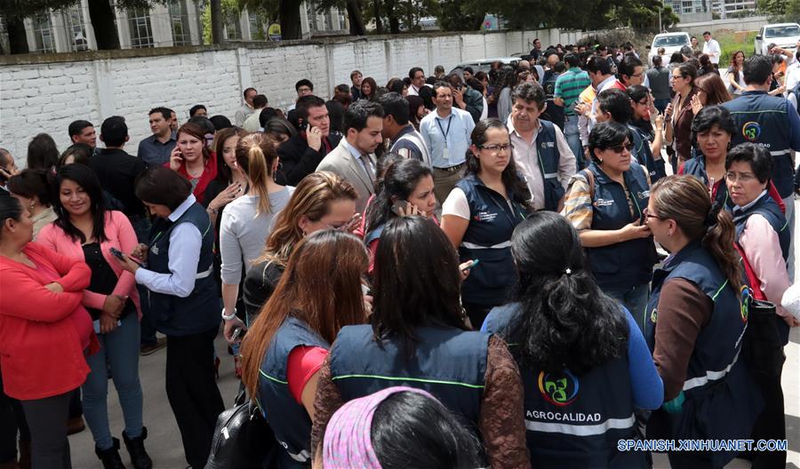 Ciudadanos reaccionan frente a sus oficinas luego del sismo de 6.7 grados en la escala de Richter, en la ciudad de Quito, capital de Ecuador, el 18 de mayo de 2016. Un nuevo sismo de 6.8 grados en la escala Richter sacudió el miércoles a las 11:46 hora local (16:46 GMT) la costa norte de Ecuador, informó el Instituto Geofísico. Previamente, otro fuerte sismo también de magnitud 6.8 grados Richter se registró en la madrugada del miércoles al sur del cantón Muisne en Esmeraldas. Según el Instituto Geofísico se tratan de réplicas del terremoto de 7.8 grados ocurrido en la costa ecuatoriana el 16 de abril, que dejó al menos 661 muertos, miles de damnificados y la destrucción de poblados turísticos. (Xinhua/Santiago Armas)