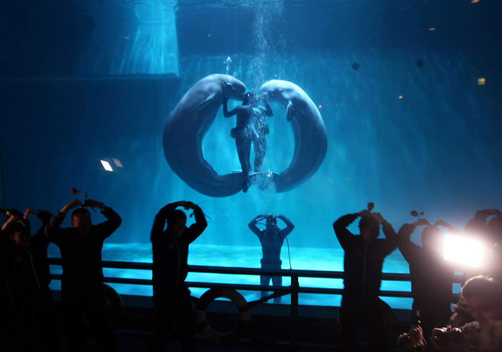 En el escenario del show "Leyenda de la Ballena Blanca" del Parque Oceanográfico Shengya de la ciudad Dalian ocurrió algo romántico: Un entrenador de leones marinos, ayudado por un colega y dos ballenas, propuso matrimonio a su novia, con quien ya compartía ocho a?os de relación, en una piscina de seis metros de profundidad. Amigos y familiares que hacían una coreografía ofrecieron a la chica rosas románticas. La propuesta de matrimonio no sólo conquistó el corazón de la novia, sino que también se ganó los aplausos de los visitantes allí presentes.