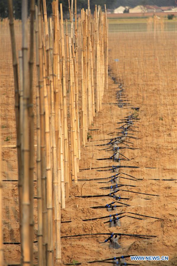 ANYANG, ,23/05/2016 (El Pueblo en Línea) - Equipo de riego por goteo en un campo del pueblo Wangxiaowang en el municipio de Neihuang, provincia de Henan. Para resolver la escasez de agua, al comienzo del verano la técnica de riego por goteo fue aplicada a los cultivos de la zona. (Foto: Xinhua/Liu Xiaokun)