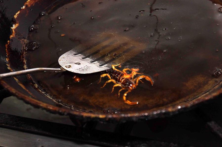 Una persona fríe un alacrán para servirlo en un taco, en Durango, México, el 23 de mayo de 2016. De acuerdo con información de la prensa local, el taco de alacrán, preparado a base de este animal que abunda en la región y que es de los más venenosos, se ha vuelto desde hace unos seis meses uno de los preferidos de los visitantes, aunque no tanto con los lugare?os, gracias a su textura crujiente y a su sabor parecido al de las papas fritas. (Xinhua/Str)