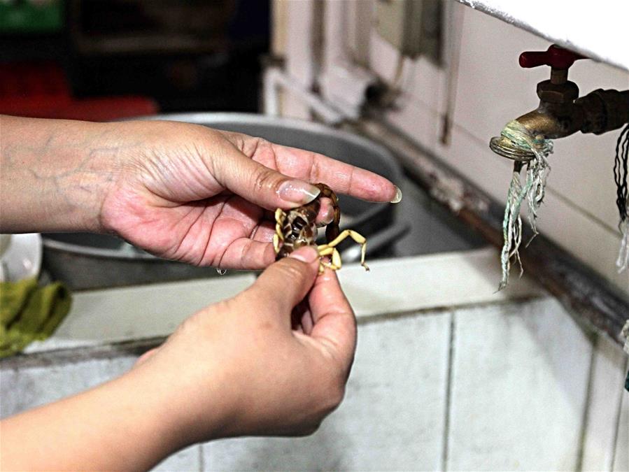 Una persona prepara un alacrán para servirlo en un taco, en Durango, México, el 23 de mayo de 2016. De acuerdo con información de la prensa local, el taco de alacrán, preparado a base de este animal que abunda en la región y que es de los más venenosos, se ha vuelto desde hace unos seis meses uno de los preferidos de los visitantes, aunque no tanto con los lugare?os, gracias a su textura crujiente y a su sabor parecido al de las papas fritas. (Xinhua/Str)