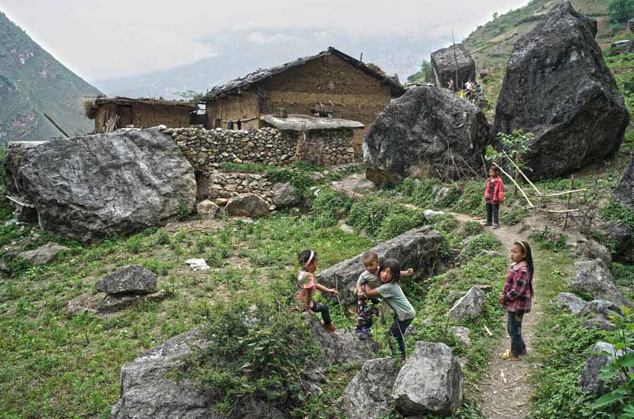 Los ni?os que no van a la escuela por problemas de seguridad o pobreza se quedan en el pueblo jugando, el 14 de mayo de 2016. Sin caminos, los pimientos y nueces que siembran los lugare?os y el ganado que crían no puede transportarse fuera de la aldea. Muy pocas chicas desean casarse con jóvenes del pueblo, y el precio de una novia en el pueblo es más bajo que en otros lugares.