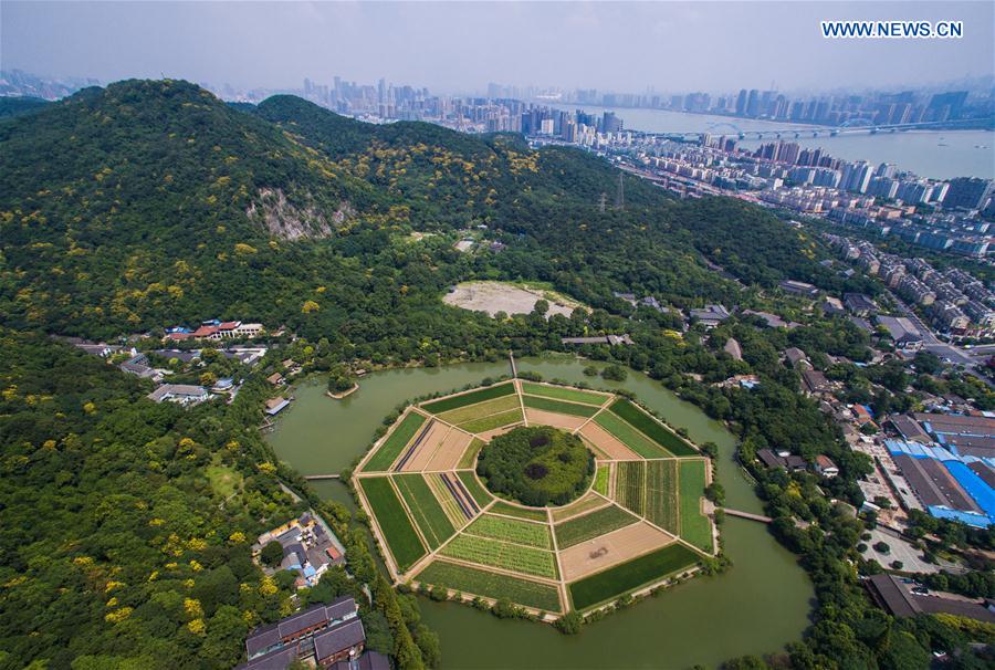 Esta foto aérea del 8 de septiembre de 2015 muestra un campo con ocho diagramas en Hangzhou, capital de la provincia de Zhejiang. China acogerá la Cumbre del G20 de 2016 en Hangzhou, una ciudad turística mejor conocida por su pintoresco Lago Oeste, el 4 y 5 de septiembre. [Foto: Xinhua]