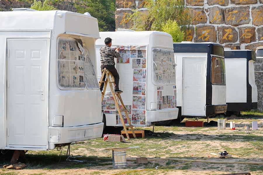 Un trabajador decora las paredes de una casa creada a partir de un autobús abandonado.