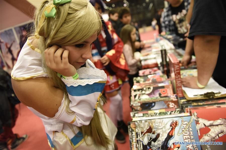 Una mujer disfrazada observa historietas durante la edición 2016 de "Montevideo Comics", en el auditorio Nacional del Sodre, en Montevideo, capital de Uruguay, el 29 de mayo de 2016. De acuerdo con información de la prensa local, la convención de historietas y animación, que se encuentra en su edición número 14, cuenta con conferencias con invitados internacionales, concursos de comics y de cosplay. (Xinhua/Nicolás Celaya)