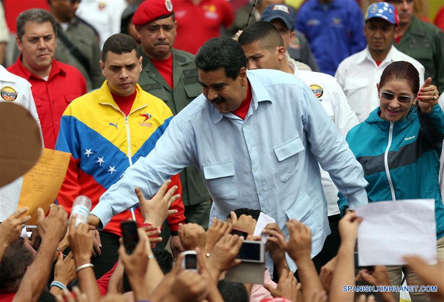 CARACAS, mayo 31, 2016 (Xinhua) -- El presidente de Venezuela, Nicolás Maduro (c), acompa?ado de su esposa Cilia Flores (d), encabeza un acto para recibir a una caravana de transportistas que se manifiestan a favor de su gobierno, en el Palacio de Miraflores, en Caracas, capital de Venezuela, el 31 de mayo de 2016. Durante el acto público con los transportistas de la nación, Nicolás Maduro dijo que el secretario general de la Organización de los Estados Americanos (OEA), Luis Almagro, "usurpa" funciones en el organismo al invocar la Carta Democrática Interamericana (CDI) para Venezuela. (Xinhua/Fausto Torrealba/AVN)