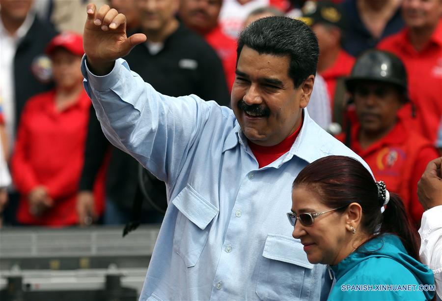 CARACAS, mayo 31, 2016 (Xinhua) -- El presidente de Venezuela, Nicolás Maduro (2-d), acompa?ado de su esposa Cilia Flores (d), encabeza un acto para recibir a una caravana de transportistas que se manifiestan a favor de su gobierno, en el Palacio de Miraflores, en Caracas, capital de Venezuela, el 31 de mayo de 2016. Durante el acto público con los transportistas de la nación, Nicolás Maduro dijo que el secretario general de la Organización de los Estados Americanos (OEA), Luis Almagro, "usurpa" funciones en el organismo al invocar la Carta Democrática Interamericana (CDI) para Venezuela. (Xinhua/Fausto Torrealba/AVN)