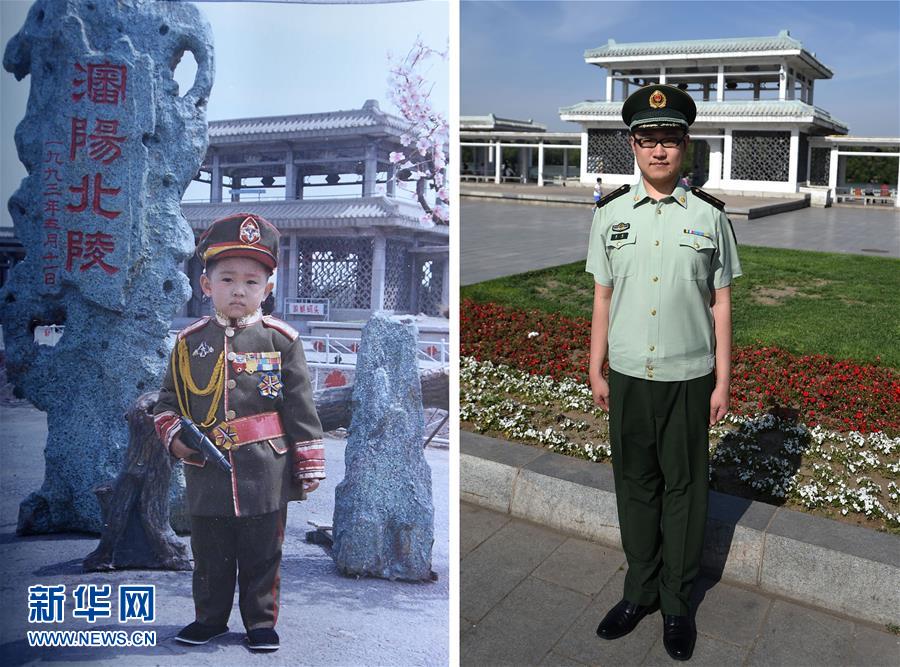 Lei Ming de 3 a?os en una imagen de 1993 y ahora que es oficial de policía repite la foto en uniforme en Shenyang. (Xinhua/Pan Yulong)