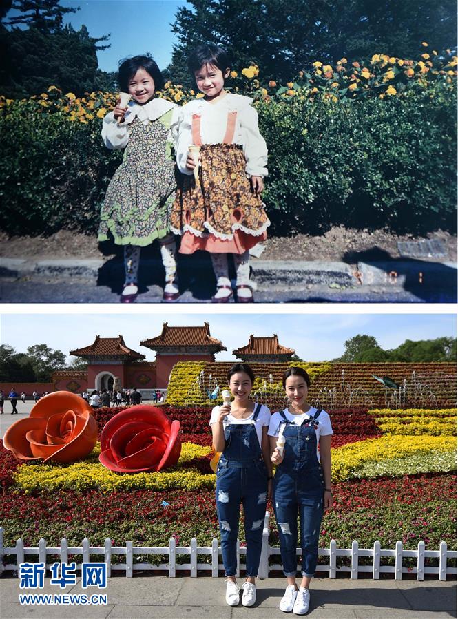 Zhang Qun y Zhang Kun son gemelas. Repiten una foto que se hicieron en 1993 cuando tenían 5 a?os para celebrar el día de los ni?os. (Xinhua/Pan Yulong)