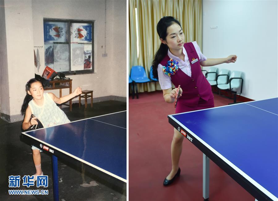 Zhao Yanqing jugando al Ping-Pong con 9 a?os en el a?o 2000 y con 25 a?os trabajando de azafata de trenes de alta velocidad. (Xinhua/canción Weiwei)