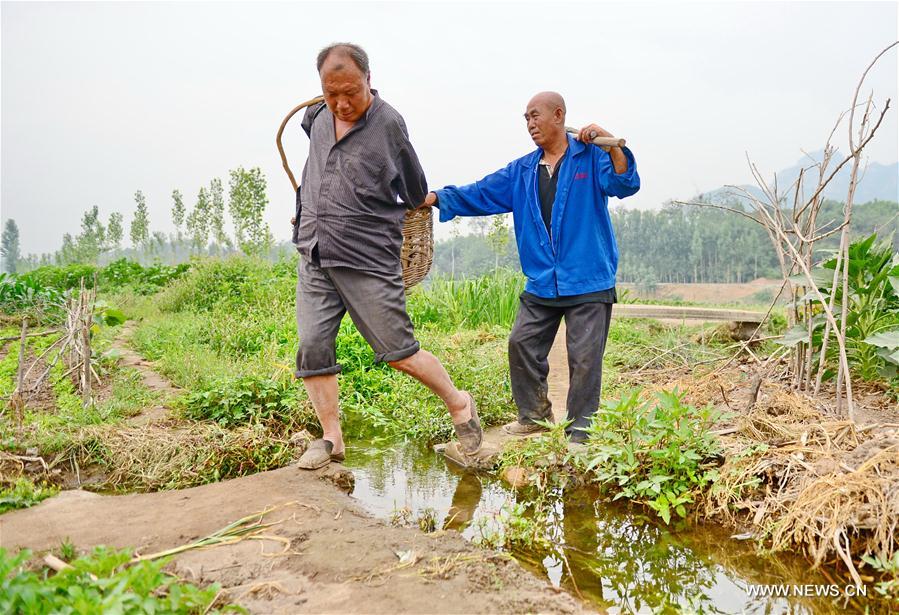 Shijiazhuang, 02/06/2016(Pueblo en Línea)-Jia Wenqi y su amigo Jia Haixia caminan por el campo en la aldea de Yeli del condado Jingxing, provincia de Hebei, el 31 de mayo de 2016. Jia Haixia, un invidente de 55 a?os, y Jia Wenqi, de 54 a?os y sin brazos, llevan 14 a?os intentando convertir un terreno árido en oasis. (Xinhua/Zhu Xudong)