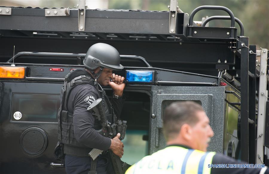 Un oficial de policía vigila en el campus de la Universidad de California Los Angeles, en Los Angeles, estado de California, Estados Unidos de América, el 1 de junio de 2016. El jefe del Departamento de Policía de Los Angeles, Charlie Beck, confirmó que el responsable del incidente ocurrido el miércoles por la ma?ana en el campus de la Universidad de California Los Angeles (UCLA) se suicidó después de matar a una persona y que el campus está seguro. (Xinhua/Yang Lei)