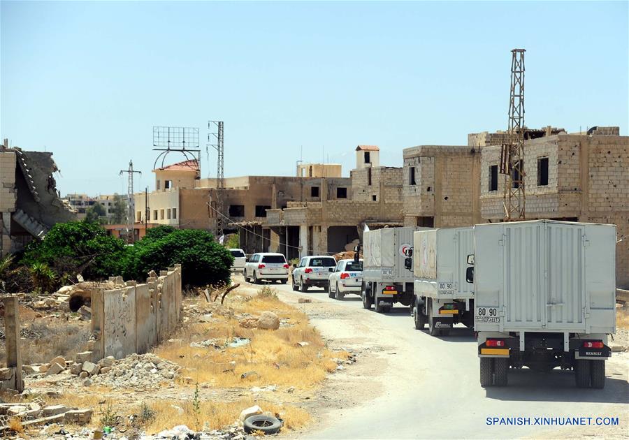 Un convoy de ayuda de emergencia entra a la ciudad sitiada por rebeldes de Daraya, cerca de Damasco, capital de Siria, el 1 de junio de 2016. La ayuda humanitaria llegó el miércoles a la ciudad sitiada de Daraya, cerca de la capital siria, Damasco, la primera vez que se recibe asistencia en la ciudad desde 2012, de acuerdo con el Comité Internacional de la Cruz Roja (CICR). Además de la operación en Daraya, otro convoy de ayuda entró en el poblado adjunto de Muadamiyeh. (Xinhua/Ammar)