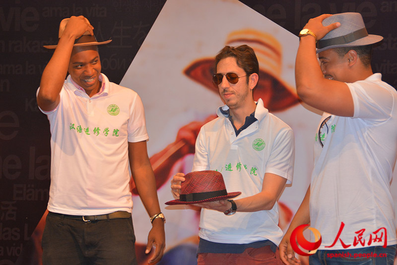 Estudiantes extranjeros de la Universidad de Lengua y Cultura de Beijing modelan sombreros de paja de toquilla (Foto: Liu Xuxia/Pueblo en Línea)