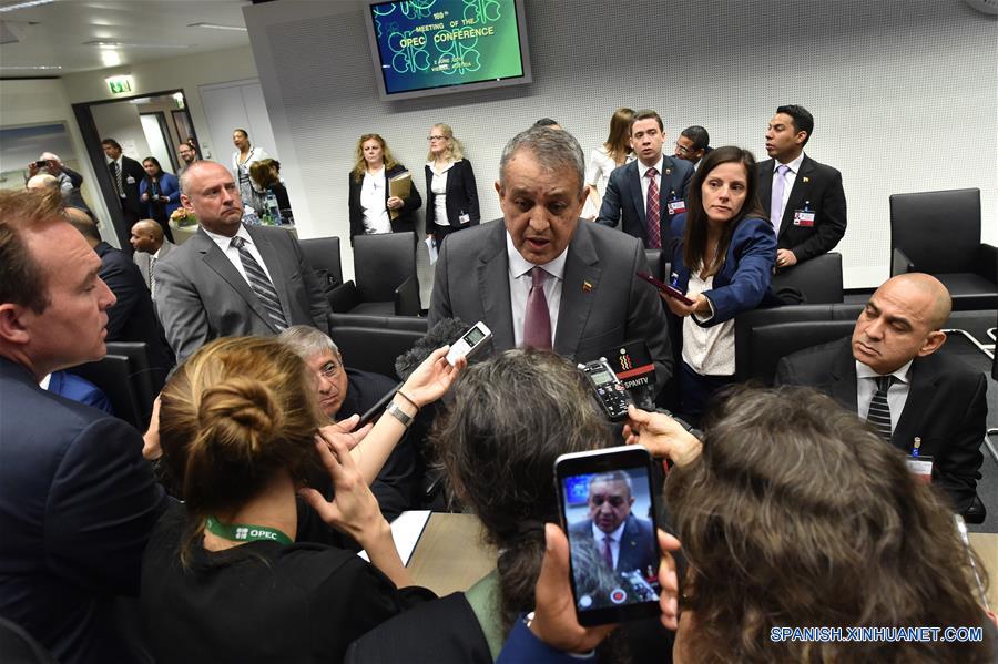 El ministro del Petróleo de Venezuela, Eulogio del Pino (c), concede una entrevista previo a la 169 reunión ordinaria de la conferencia de la Organización de Países Exportadores de Petróleo (OPEP), en Viena, capital de Austria, el 2 de junio de 2016. (Xinhua/Qian Yi)