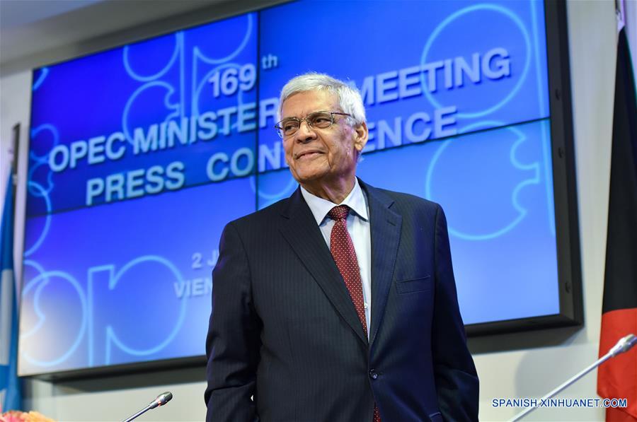 El secretario general de la Organización de Países Exportadores de Petróleo (OPEP), Abdalla Salem el-Badri, se prepara para retirarse al finalizar una conferencia de prensa, en Viena, capital de Austria, el 2 de junio de 2016. Una vez más, la Organización de Países Exportadores de Petróleo OPEP no logró llegar a ningún acuerdo para establecer un tope a la producción petrolera después de la reunión realizada el jueves en Viena, dijo un funcionario de OPEP. (Xinhua/Qian Yi)