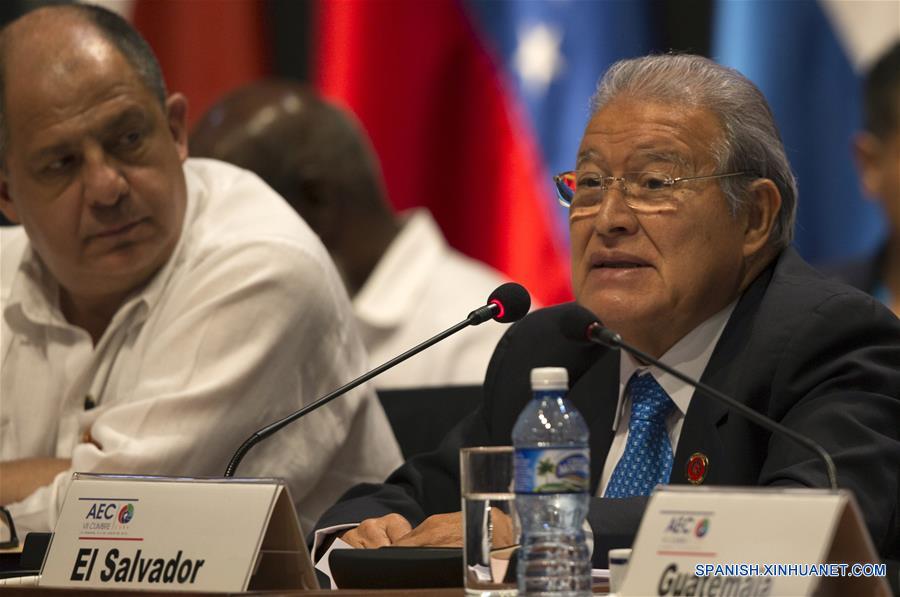 El presidente de El Salvador, Salvador Sánches Cerén (d), participa durante la VII Cumbre de la Asociación de Estados del Caribe (AEC), en La Habana, Cuba, el 4 de junio de 2016. Presidentes de los países miembros de la AEC ratificaron el sábado el compromiso de buscar acciones concretas comunes para afrontar el cambio climático que amenaza la existencia misma de algunas naciones del área. (Xinhua/Ismael Francisco/Cubadebate)