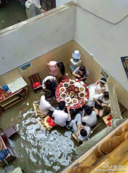 Las fuertes lluvias de los últimos días han azotado en varias provincias de China, pero ni siquiera las inundaciones han logrado postergar la celebración de una boda en la provincia de Hubei. El comedor de la casa estaba lleno de agua, pero todos los invitados asistieron y disfrutaron de la celebración nupcial. [Foto: weibo.com]