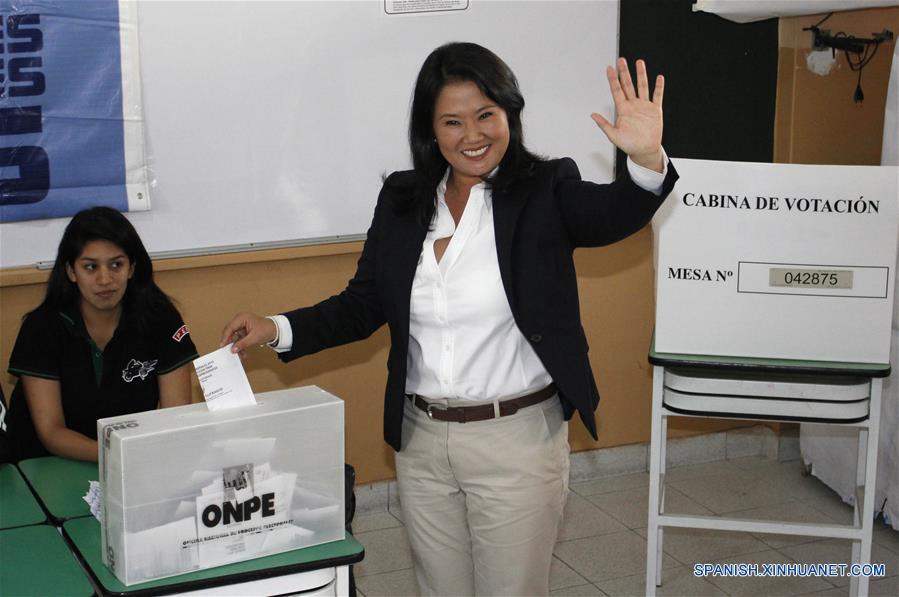 LIMA, 5 jun (Xinhua) -- La candidata presidencial peruana Keiko Fujimori hizo un saludo de victoria ante sus seguidores que se concentraron hoy en las inmediaciones del Hotel Melía, del exclusivo distrito de San Isidro, en el centro de la ciudad de Lima.