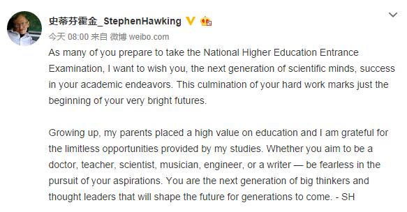 Beijing, 07/06/2016(Pueblo en Línea)-Con la llegada del gaokao o examen nacional de acceso a las universidades públicas, el famoso físico y teórico Stephen Hawking publicó un mensaje en su cuenta Weibo deseando éxito a los estudiantes chinos.