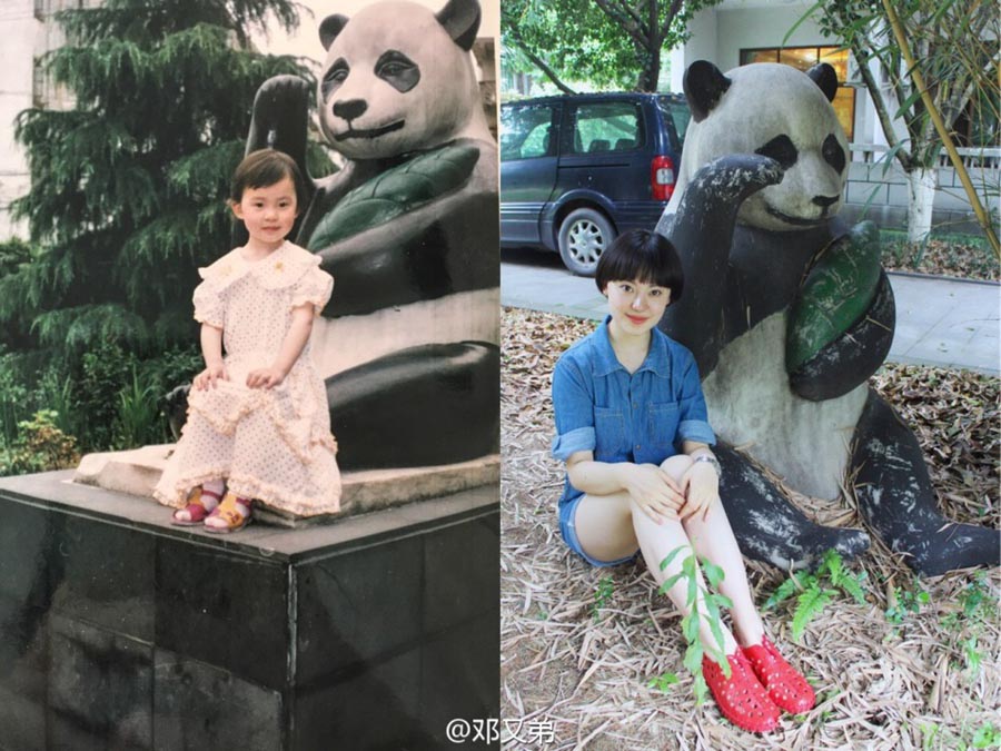 Dengyoudi junto a una escultura de un panda. [Foto/Sina Weibo]
