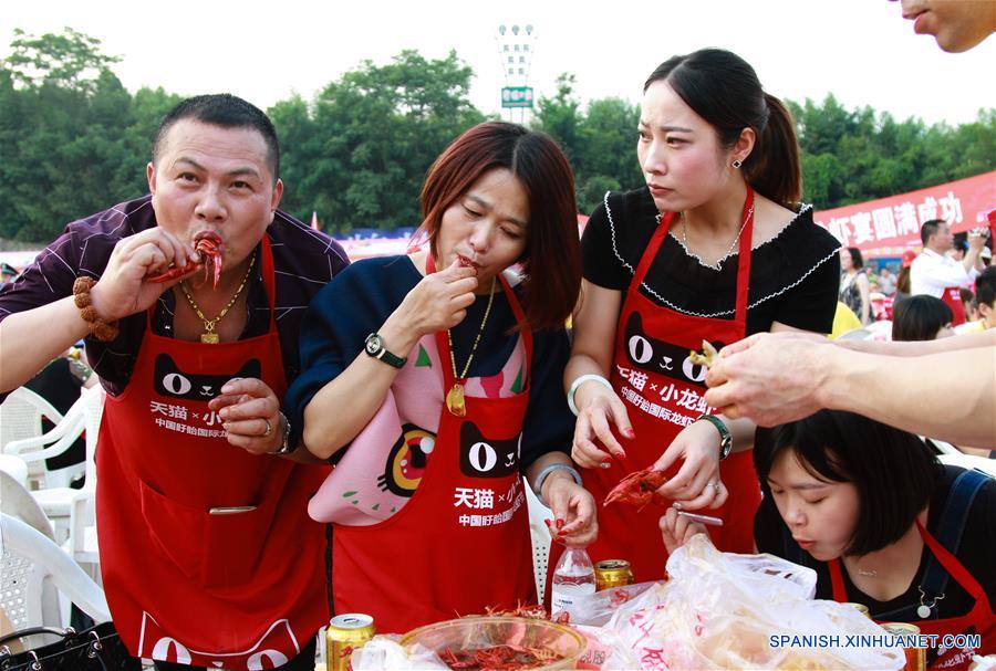 JIANGSU, junio 13, 2016 (Xinhua) -- Personas comen cangrejos de río durante una semana de la comida en el condado Xuyi de Huai'an, en la provincia de Jiangsu, en el este de China, el 13 de junio de 2016. Cerca de 30,000 personas acudieron el lunes a la semana de la comida de langostas de río. Aproximadamente 30 toneladas de langostas de río fueron vendidas durante el evento. (Xinhua/Li Xiang)
