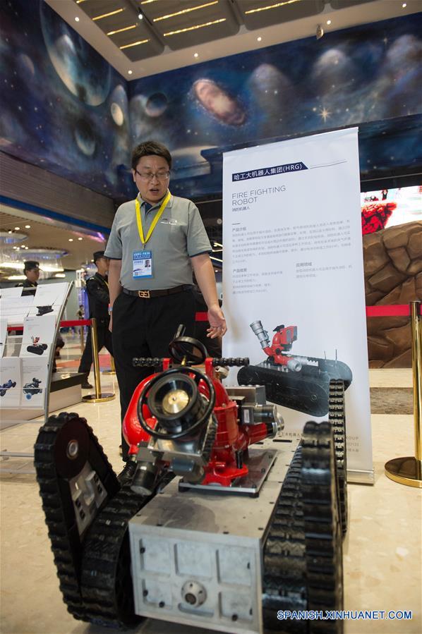 KUNMING, 12 jun (Xinhua) -- Un robot bombero estaba en exhibición en un centro de experiencia de robot en Kunming, capital de la provincia suroccidental china de Yunnan, el 12 de junio. (Xinhua/Hu Chao)