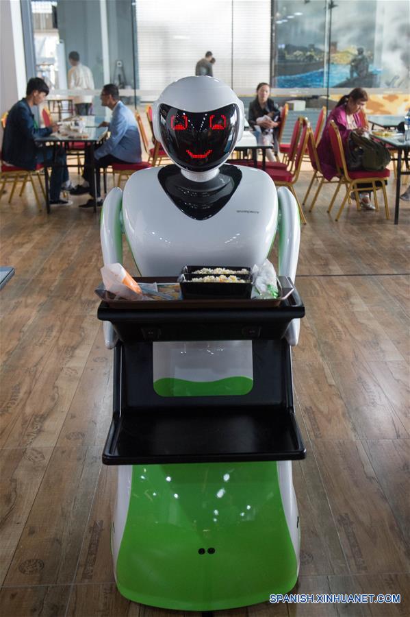 KUNMING, 12 jun (Xinhua) -- Una robot mesera atendió platos en un centro de experiencia de robot en Kunming, capital de la provincia suroccidental china de Yunnan, el 12 de junio. (Xinhua/Hu Chao)