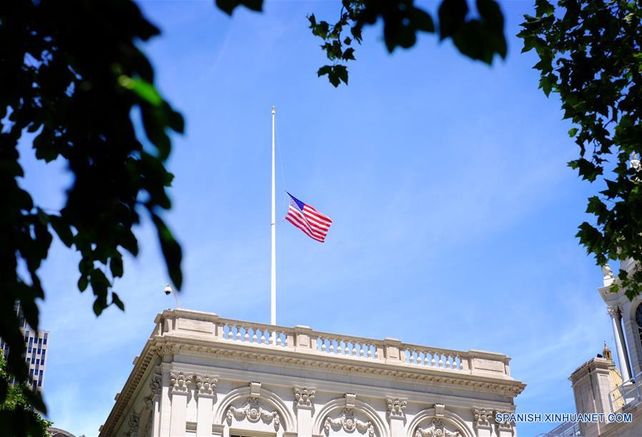 Banderas nacionales estadounidenses ondean a media asta en La Suprema Corte de Nueva York en memoria de las víctimas del tiroteo masivo en el centro nocturno gay "Pulse" en Nueva York, Estados Unidos de América, el 13 de junio de 2016. (Xinhua/Qin Lang)