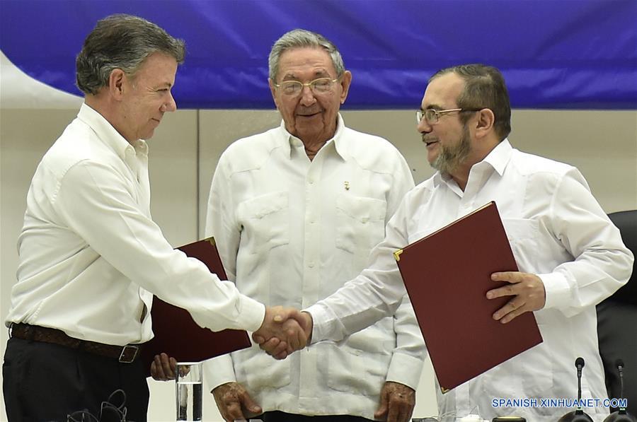 El presidente de Colombia, Juan Manuel Santos (i), el presidente de Cuba, Raúl Castro (c) y Timoleón Jiménez (d) alías "Timochenko", líder de las Fuerzas Armadas Revolucionarias de Colombia (FARC), participan en la firma del acuerdo del fin del conflicto armado entre el gobierno de Colombia y las FARC, en La Habana, Cuba, el 23 de junio de 2016. Luego del anuncio hecho el miércoles por el Gobierno de Colombia y la guerrilla de las Fuerzas Armadas Revolucionarias de Colombia (FARC), sobre la firma del acuerdo sobre fin del cese al fuego bilateral y dejación de armas con el que se vislumbra la última etapa del proceso de paz entre las partes, fueron muchas las voces que se escucharon para apoyar el que se ha llamado "el último día de la guerra" en el país andino después de más de 50 a?os. (Xinhua/Str)