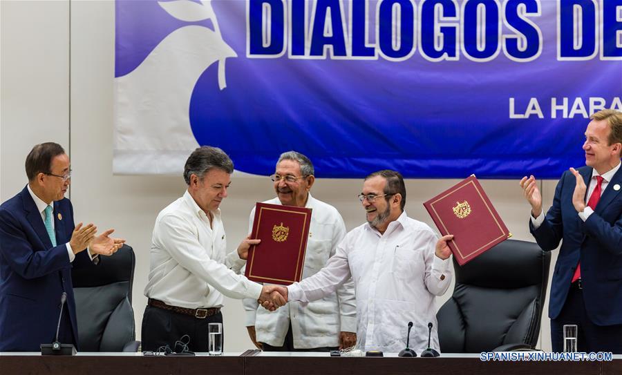 El presidente de Colombia, Juan Manuel Santos (2-i), el presidente de Cuba, Raúl Castro (c) y Timoleón Jiménez (2-d) alías "Timochenko", líder de las Fuerzas Armadas Revolucionarias de Colombia (FARC), participan en la firma del acuerdo del fin del conflicto armado entre el gobierno de Colombia y las FARC, en La Habana, Cuba, el 23 de junio de 2016. Luego del anuncio hecho el miércoles por el Gobierno de Colombia y la guerrilla de las Fuerzas Armadas Revolucionarias de Colombia (FARC), sobre la firma del acuerdo sobre fin del cese al fuego bilateral y dejación de armas con el que se vislumbra la última etapa del proceso de paz entre las partes, fueron muchas las voces que se escucharon para apoyar el que se ha llamado "el último día de la guerra" en el país andino después de más de 50 a?os. (Xinhua/Liu Bin)