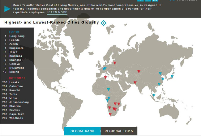 El informe, publicado el miércoles por la consultoría Mercer, dijo que Hong Kong ha superado Luanda, capital de Angola, que ahora ocupa el segundo puesto de las ciudades con un coste de vida más alto. A estas dos urbes les siguen Zurich, Singapur y Tokio.