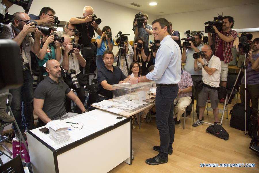 Pedro Sánchez (c), líder del Partido Socialista Obrero Espa?ol (PSOE), emite su voto en Pozuelo de Alarcón, cerca de Madrid, Espa?a, el 26 de junio de 2016. Los 36,518,100 espa?oles con derecho a voto este domingo comenzaron a acudir a los colegios electorales desde las 09:00 hora local (07:00 GMT), en unos comicios que elegirán a los 350 diputados y 208 senadores que formarán parte de la próxima legislatura y Gobierno de Espa?a. (Xinhua/Javier Ortega Ponce)
