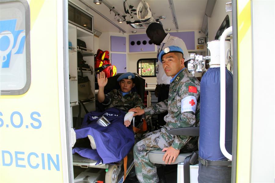 Si Chongchang (a la izquierda), soldado chino de la Fuerza de Paz de la ONU, sale de un hospital en Dakar, Senegal, el 26 de junio del 2016. Los cuatro cascos azules chinos que fueron heridos en Mali durante un ataque terrorista partieron hacia la patria. (Foto: Wang Meng)