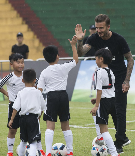 David Beckham saluda a varios ni?os tras jugar al fútbol en la escuela de secundaria Zhixin de Guangzhou, provincia de Guangdong, el 28 de junio de 2016.