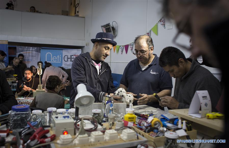 Dos hombres intentan reparar un perro mecánico durante el evento "Club de Reparadores", en Buenos Aires, capital de Argentina, el 2 de julio de 2016. Amigos, desconocidos o simples curiosos, expertos y amateurs se reunieron el sábado en Buenos Aires, pese a la lluvia, para una nueva edición del "Club de reparadores", iniciativa que impulsa la reparación de objetos. Melina Scioli, una de las organizadoras, explicó que el Club es un evento itinerante de reparación colectiva, "un encuentro que propiciamos para reunir a reparadores profesionales, reparadores amateurs y a gente que tiene la voluntad de aprender a reparar objetos". Se busca "extenderles la vida útil y evitar que se terminen convirtiendo en residuos", enfatizó. (Xinhua/Martín Zabala)