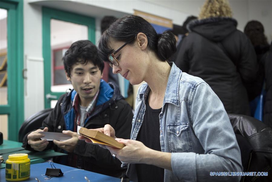 Dos personas intentan reparar la tapa de un libro durante el evento "Club de Reparadores", en Buenos Aires, capital de Argentina, el 2 de julio de 2016. Amigos, desconocidos o simples curiosos, expertos y amateurs se reunieron el sábado en Buenos Aires, pese a la lluvia, para una nueva edición del "Club de reparadores", iniciativa que impulsa la reparación de objetos. Melina Scioli, una de las organizadoras, explicó que el Club es un evento itinerante de reparación colectiva, "un encuentro que propiciamos para reunir a reparadores profesionales, reparadores amateurs y a gente que tiene la voluntad de aprender a reparar objetos". Se busca "extenderles la vida útil y evitar que se terminen convirtiendo en residuos", enfatizó. (Xinhua/Martín Zabala)