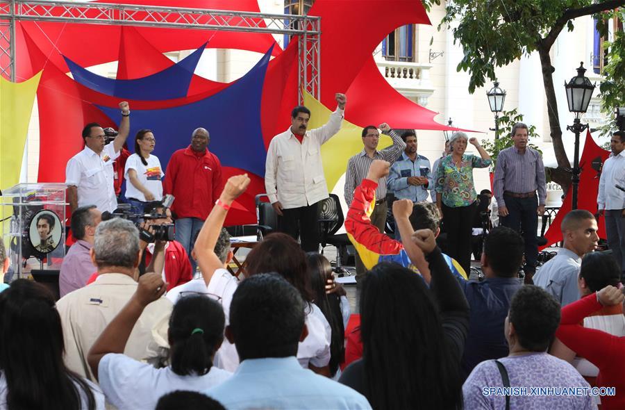 El presidente venezolano Nicolás Maduro (c) encabeza el acto público para conmemorar el vigésimo tercer aniversario de la Misión Robinson en la Plaza Bolívar, en Caracas, Venezuela, el 2 de julio de 2016. De acuerdo con la prensa local, la Misión Robinson es un programa social para alfabetizar a personas excluidas de la educación formal y capacitarlas en diversos oficios productivos. Más de 70,000 alfabetizados se han graduado de la educación primaria y continuarán con un bachillerato productivo. (Xinhua/AVN)