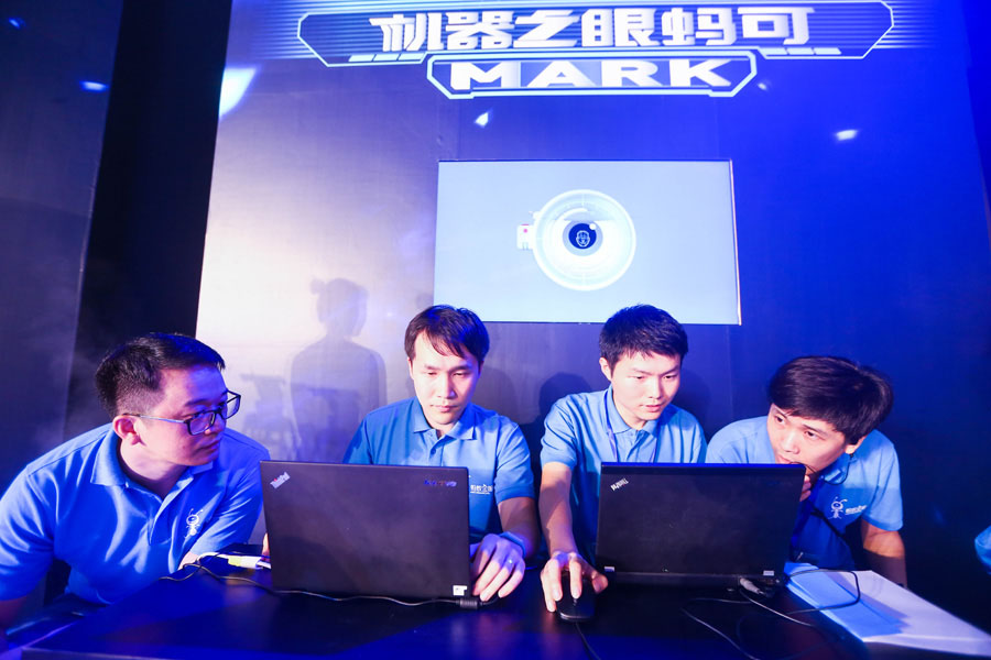 Un miembro del equipo de desarrollo de la máquina biométrica 'Mark' graba información de las fotos durante el concurso de reconocimiento facial celebrado en Hangzhou, capital de la provincia de Zhejiang, el 30 de junio de 2016.