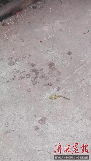 Manchas de sabgre sobre el suelo después de que el gallo se arrancara una pata. [Foto/Jiyuan Morning News]