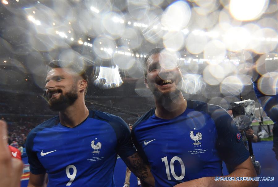 PARIS, 4 jul (Xinhua) -- Olivier Giroud (I) y Andre-Pierre Gignac de Francia celebran la victoria tras el torneo entre Francia e Islandia en los cuartos de final de la Eurocopa en París, Francia, el 3 de julio de 2016, en el que Francia ganó 5-2. (Xinhua/Tao Xiyi)