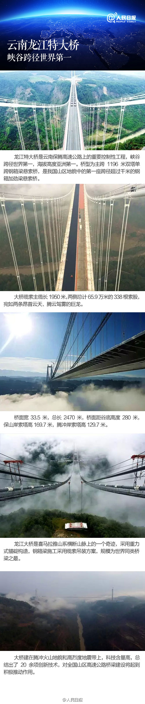 El puente, que el 20 de abril comenzó a brindar servicio en la provincia de Yunnan, une a las ciudades Baoshan y Tengchong. Tiene una longitud de más de 2.470 metros, una altura de 280 metros y costó más de 300 millones de dólares.