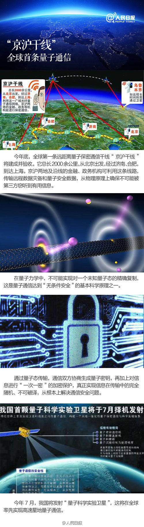 China inició el desarrollo de su satélite cuántica en 2011, y puso en marcha el proyecto de fibra óptica cuántica de comunicación de red, la línea Beijing-Shanghai, en el a?o 2013. La cuantía línea de comunicaciones privadas Beijing-Shanghai cubrirá una longitud total de más de 2.000 kilómetros, que conecta una red de numerosas ciudades, entre ellas Beijing, Jinan, Hefei y Shanghai. Esta será la primera fibra óptica cuántica red privada de área extensa del mundo.