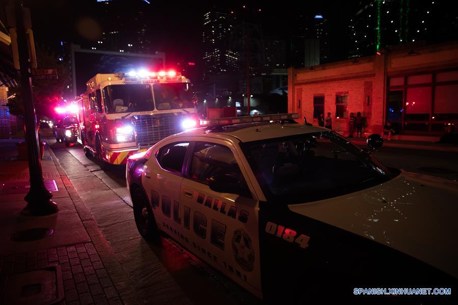 Vehículos de la policía patrullan en el centro de Dallas, después de un tiroteo en Dallas, estado de Texas, Estados Unidos de América, el 7 de julio de 2016. Cinco policías murieron y otros seis resultaron heridos el jueves por la noche tras ser alcanzados por dos francotiradores que abrieron fuego durante una manifestación contra los tiroteos protagonizados por agentes de la policía en todo Estados Unidos. (Xinhua/Tian Dan)