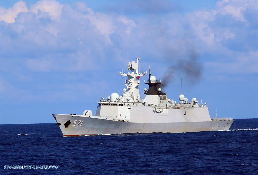 MAR MERIDIONAL DE CHINA, julio 8, 2016 (Xinhua) -- La fragata de misiles Yuncheng navega a la zona de aguas cerca de la isla de Hainan y las islas de Xisha de China, el 8 de julio de 2016. La Marina china realizó este viernes un ejercicio de combate anual en la zona de aguas cerca de la isla de Hainan y las islas de Xisha de China. (Xinhua/Zha Chunming)